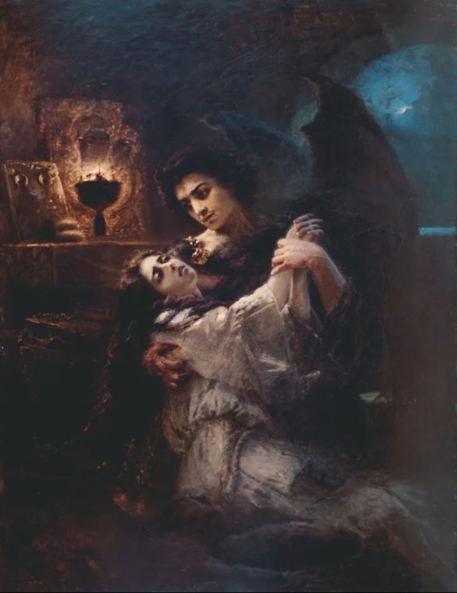 В сумрачной келье, где время словно остановилось, застыл миг, в котором переплелись вечность и гибель. Картина Константина Маковского «Демон и Тамара» (1889) — не просто иллюстрация к лермонтовской поэме. Это дверь в мир, где любовь оборачивается проклятием, а страсть становится смертельным даром. Два мира, две судьбы. В центре полотна — объятие, от которого веет ледяной дрожью. Демон, прекрасный и страшный, держит в руках Тамару — девушку, чья жизнь тает, как последний луч заката. Он — не карикатурный искуситель, а существо, раздираемое противоречиями. В его взгляде нет торжества, лишь горькое осознание: он получил то, чего желал, но счастья не обрёл. Его поза — натянутая струна между победой и поражением. Крылья, тёмные, как ночная бездна, кажутся не символом власти, а клеймом вечного изгнания. Она — хрупкая, словно цветок, сорванный на рассвете. Белоснежное платье, будто последний отблеск невинности, контрастирует с мраком, окутавшим келью. Руки сложены так, что невозможно пон