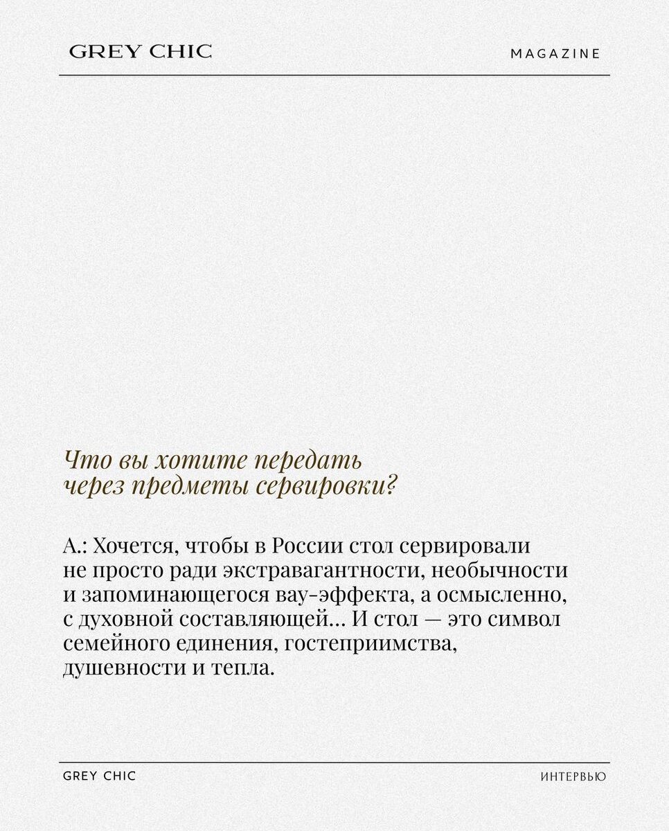 Ценности, которые не теряют актуальности Уже совсем скоро мы соберемся за роскошно накрытыми столами, в кругу близких и родных, чтобы встретить главный семейный праздник — Новый год. В декабре мы вновь обращаемся к ценностям и традициям, а для кого-то — это отличная возможность сформировать собственные, выбирая предметы, которые смогут прожить долгую жизнь. Делимся отрывками из интервью с основательницей проекта «В поисках утраченного ковчега» Анастасией Андреевской. Мы поговорили о том, что именно превращает посуду в будущую реликвию и как старинные орнаменты обретают новое звучание. Полную статью читайте на нашем сайте. Спешим сообщить, что изделия бренда «В поисках утраченного ковчега» можно будет найти на маркете «Светский винтаж» 13 и 14 декабря в пространстве VOKZAL 1853. GREY CHIC
