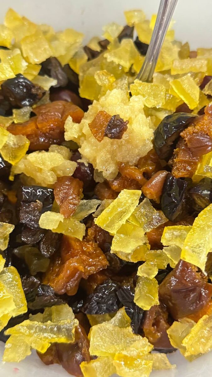 Фруткейк рецепт Хочу с вами поделиться моей версией этого рецепта. ⠀ Зацените этого красавчика и обязательно ставьте лайк посту, оставляйте “спасибо” в комментариях! ❤️Для вас секунда - для меня ваша благодарность❗️❗️❗️❗️❗️ ⠀ 👉Нам понадобится: 700 г сухофруктов (можете взять что вы любите: изюм, чернослив, курагу, вишню, клюкву, инжир, цукаты лимона/амельсина, кумкват и пр) У меня: 300г сладкая вишня🍒 100 г курага🍑 100 г чернослив 100 г цукаты лимона🍋 100 г ананас🍍 цедра 1 лимона 50г инвертного сиропа 60г + 30г бренди/рос/коньяк 90г коричневого сахара (можно белый, можно мусковадо) 120г яиц (примерно 2шт СО)🥚🥚 115г мягкого масла 🧈сливочного 82,5% 25г измельченного миндаля (или муки) 90г пшеничной муки щепотка соли ⅓ ч.л корицы ⅓ ч.л молотой гвоздики ¼ ч.л мускатного ореха ⠀ ✅ПРИГОТОВЛЕНИЕ: ⏺️За сутки смешиваем в чаше все сухофрукты, цедру, инвертный сироп\сахар и 60г бренди, закрываем и оставляем при комнатной температуре. ⏺️На следующий день в большой миске смешиваем темный с