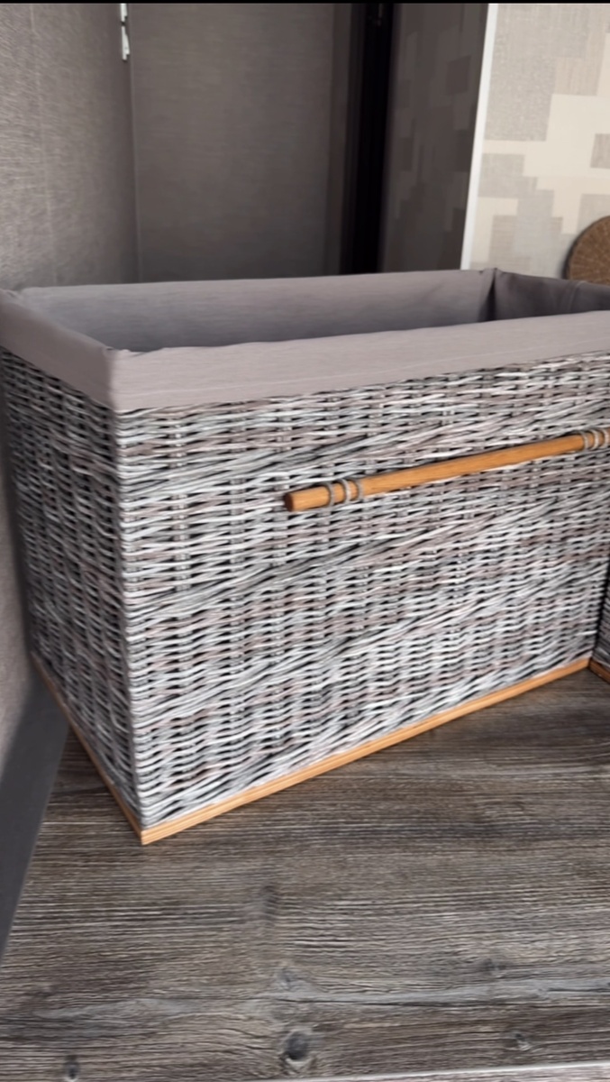 Серая плетёная корзина — это одновременно практичный предмет хранения и стильный элемент интерьера. Данная прямоугольная корзина с аккуратным, равномерным плетением, контрастной деревянной базой и тонкой деревянной ручкой. Внутри — съёмный серый хлопковый чехол, повышающий удобство использования и придающий изделию законченный вид. Функциональность • Универсальность: корзина подходит для хранения белья, игрушек, пледов, сезонной одежды, аксессуаров, хозяйственных мелочей. • Лёгкость доступа: широкий верх делает укладку и извлечение вещей простыми. Стиль и применение в интерьере • Скандинавский минимализм: светло-серый тон и натуральные деревянные элементы прекрасно сочетаются с белыми и пастельными поверхностями. • Современная классика: корзина добавит текстуры и организованности в гостиную или спальню. • Прованс и рустик: в сочетании с льняной тканью, пледами и растениями создаст уютную атмосферу. • Идеи размещения: в прихожей для обуви или зонтов, в ванной для полотенец, белья, в