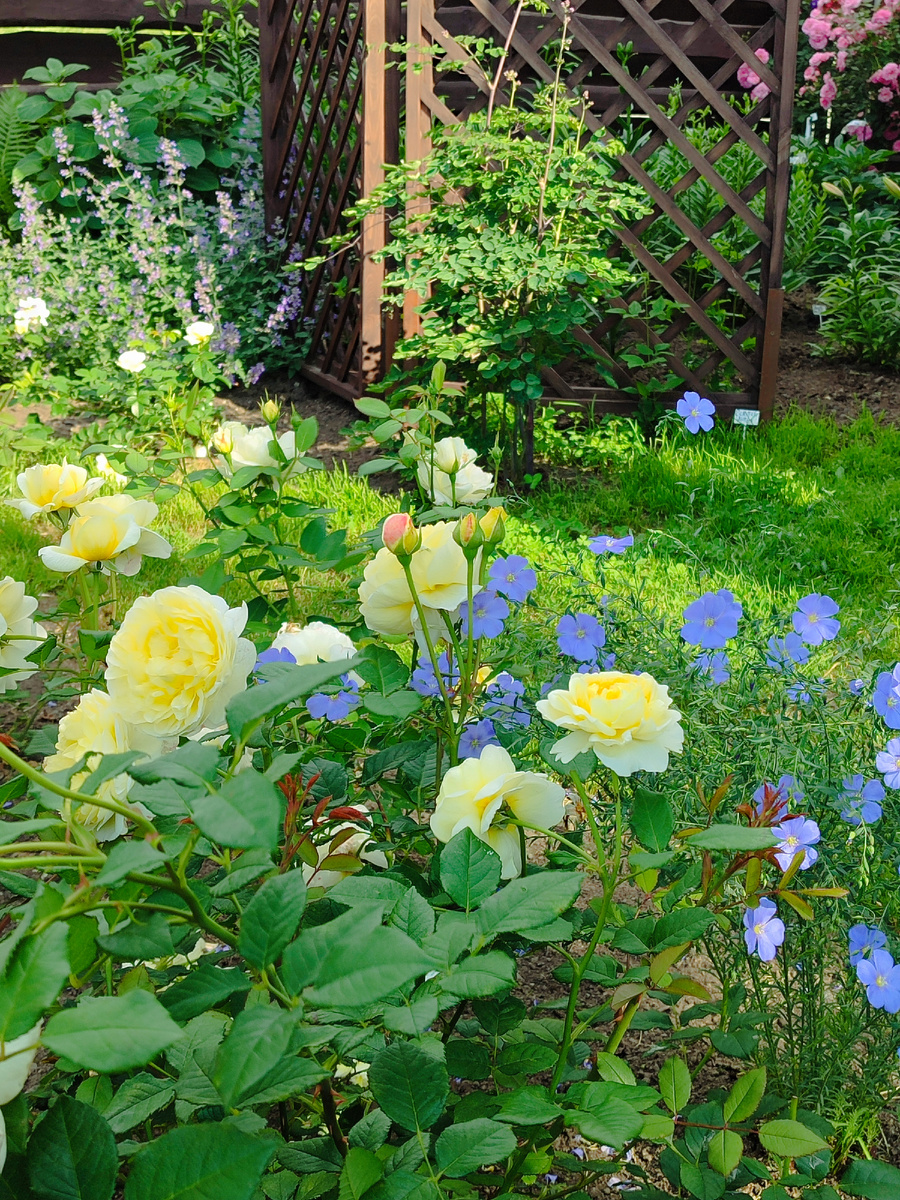 Лён быстро разрастается, один из первых зацветает, долго цветёт и сохраняет декоративность при минимальном уходе. Очень красиво смотрится в моём жёлтом розарии.