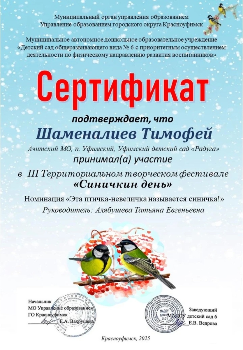 Дети старшей группы "Светлячки" под руководством воспитателя Алябушевой Т. Е. приняли участие в III Территориальном творческом фестивале "Синичкин день" и получили сертификаты за участие. Также дети совместно с родителями приняли участие в VII межтерриториальном конкурсе творческой направленности "Почитай мне, мама..."
