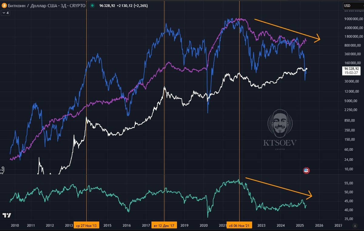 Сегодня расковыряем метрики глобального движения денег. Смотрите скриншот – на графике изображены: ✍️ 🟠 Bitcoin - белая линия; 🟠 Глобальная ликвидность (малиновый цвет) + график с поправкой на важные индексы (синий цвет). 🟠 Бизнес циклы (зеленый цвет). 📍 Также для удобства я отметил все прошлые максимумы Биткоина в каждом цикле. 🪫 Как видите, со времен прошлого ATH Биткоина (2021) все приведенные метрики глобально показывали понижательное движение в то время, когда Биткоин всё-таки устанавливал новые максимумы. Это говорит о том, что ликвидность утекала куда-то не туда, преимущественно она отдавалась наиболее надежным активам, например технологическим компаниям-гигантам и золоту (подробнее читайте тут: анализ #1 и анализ #2). А оставшаяся часть средств поступала в перспективные инструменты с явно повышенным риском, отсюда и рост битка. 💯 🔋 Но вскоре эта ситуация изменится. Текущая картина говорит нам о достаточно хороших перспективах, думаю, это понимает любой трейдер, умеющий