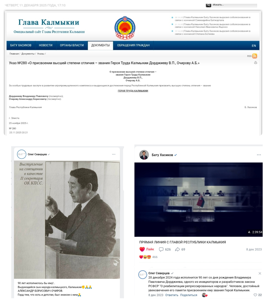 В преддверии очередной Прямой линии Главы Калмыкии Бату Хасикова 17 декабря в 14:00, вспомнил: На одну из предыдущих Прямых линий (в декабре 2023 г.) я предлагал отметить вклад Владимира Павловича Дорджиева в развитие Калмыкии - присвоить ему посмертно звание "Почетный гражданин Республики Калмыкия". Периодически писал в своих соцсетях об Александре Борисовиче Очирове. Устно вносил руководству предложение отметить его вклад в развитие Калмыкии - присвоить ему посмертно звание "Почетный гражданин Республики Калмыкия". Тогда ещё не было установлено звание "Герой труда Калмыкии". 25 ноября 2025 г. Указом Главы Калмыкии за особые трудовые заслуги в развитии агропромышленного комплекса и выдающиеся достижения перед Республикой Калмыкия присвоена посмертно высшая степень отличия – звание "ГЕРОЙ ТРУДА КАЛМЫКИИ" Дорджиеву Владимиру Павловичу и Очирову Александру Борисовичу. Рад, что и мой вклад вместе с другими земляками есть в деое увековечения имен этих выдающихся государственных де