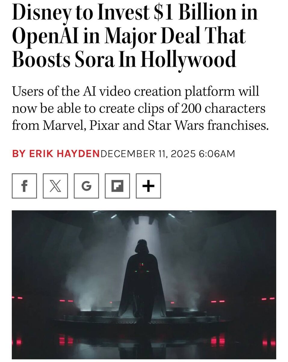 Disney заливает МИЛЛИАРД в OpenAI — Sora и ChatGPT легализуют Мстителей и джедаев Disney инвестирует $1 млрд в OpenAI. В переводе на человеческий: скоро нейросети смогут без страха и упрёка генерировать картинки и ролики с героями Marvel, Pixar и «Звёздных войн» — официально, по лицензии, а не как сейчас, полулегальный фан-арт из закоулков интернета. Представьте: — ИИ-сериал по вселенной Marvel, собранный под ваш вкус; — кастомные мульты в стиле Pixar с вашим лицом; — Sora, которая штампует альтернативные версии «Звёздных войн», где у Хана Соло наконец-то нормальный финал. Корпорации заходят в генеративку серьёзно: больше никаких «нельзя, это чужой IP» — теперь всё своё и монетизируемое. Вопрос на миллион: это победа фанатов или начало максимально контролируемого фан-сервиса? #Techtaim