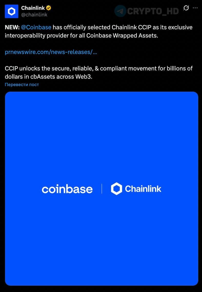 🤑 #LINK Биржа Coinbase выбрала Chainlink CCIP в качестве эксклюзивного моста для своих обернутых активов на $7,000,000,000 – анонс Ранее: - Chainlink ETF - индексы от FTSE Russell - ЦБ Бразилии и Гонконга - Deutsche Bank и DWS - S&P Global - банк UBS - SWIFT - Министерство торговли США Crypto Headlines
