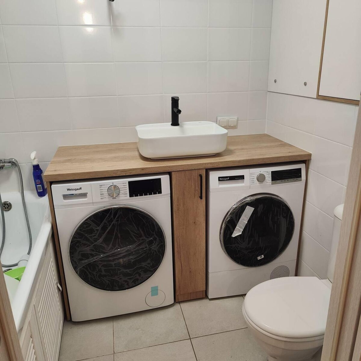 Прошлой осенью ко мне обратилась Ольга с простой проблемой: «не могу найти идеальное решение для своей ванны комнаты». Сегодня вы видите её тумбу под стиральную машинку и сушилку с утолщенной столешницей. Конструкция для инсталляции с встроенным шкафом. Шкаф в нишу и фальш-щит. ЛДСП под два вида дерева и белые фасады в МДФ в пленке. Стоимость данного комплекта всего 84 000 ₽, а Ольга пишет: «Это именно то, что я хотела!». Расскажу, как мы вместо «невозможного» создали идеальное решение для маленького пространства. Почему нельзя экономить на качестве?! В нашем бизнесе я часто вижу одну картину: клиент экономит на материалах или фурнитуре, а через год вынужден переделывать мебель заново. Мы никогда не идём на такие компромиссы. Каждая деталь в наших проектах проходит тщательный контроль. Для механизмов выбираем только проверенные системы с доводчиками. Для стеклянных элементов — только закалённое стекло с защитной плёнкой. Да, это делает наши изделия дороже, но они служат годами без рем
