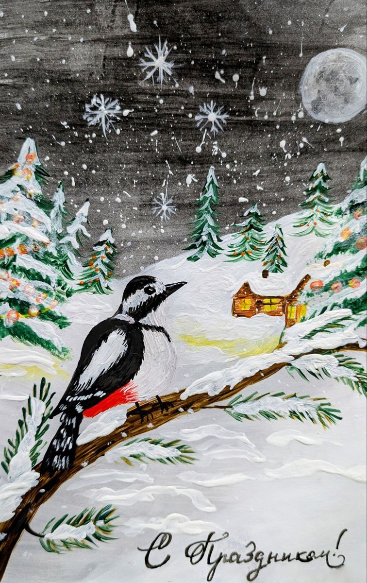 🎄Праздничное послание от лесного жителя❄️ Я подготовила открытку для участия в конкурсе «Праздничное послание», посвящённом пернатым обитателям заказника «Приазовский» — места, где природа дышит свободно и звонко, как стук дятла по дереву! Организатор — ФГБУ «Кавказский государственный природный биосферный заповедник имени Х.Г. Шапошникова». На моей открытке — большой пёстрый дятел (Dendrocopos major), сидящий на ветке в зимнем лесу под падающим снегом. Вдали — тёплый свет из окон домика, а над всем этим — луна и снежинки, словно напоминающие: даже в самую холодную пору природа полна жизни и чудес. Это не просто птица — это символ упорства, заботы о лесе и праздничного настроения, которое мы можем подарить друг другу, бережно относясь к окружающему миру. С наступающим праздником! #ПраздничноеПослание #КавказскийЗаповедник #БольшойПестрыйдятел #DendrocoposMajor #РисунокПтицы #ЗимняяОткрытка