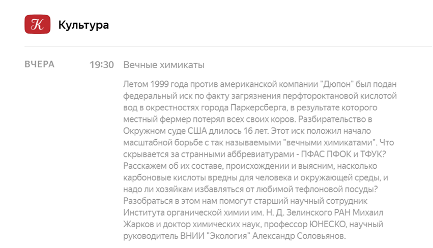 10-го декабря 2025 г на канале «Культура» показали получасовой репортаж о «вечных химикатах». Выступал доктор химических наук и сказал буквально, что во всём мире очень мало информации и исследований в этой области, и, типа того, что, пока нам и не стоит беспокоиться (см. скриншот ниже). Но, тогда получается, что европейские средства информации врут, что на конец 2024-го года в Европе было обнаружено около 23 000 площадок, загрязненных «вечными химикатам» (https://dzen.ru/a/Z1sK2EZ4xX9Ns8rI )? Значит, официальные органы США и Европейского союза напрасно паникуют, когда издают для населения рекомендации о том, как уменьшить воздействие «вечных химикатов» на организм (https://dzen.ru/a/Z9sV9yAJ_ncndJjU )? Значит, власти Франции и других государств просто от страха издают законы, запрещающие использование «вечных химикатов» в косметике, лыжных мазях и одежде (https://dzen.ru/a/Z8XN3c8xRiHx7V3a )? Значит, компания DuPont и 3M просто из-за человеколюбия согласились выплатить неустойку в