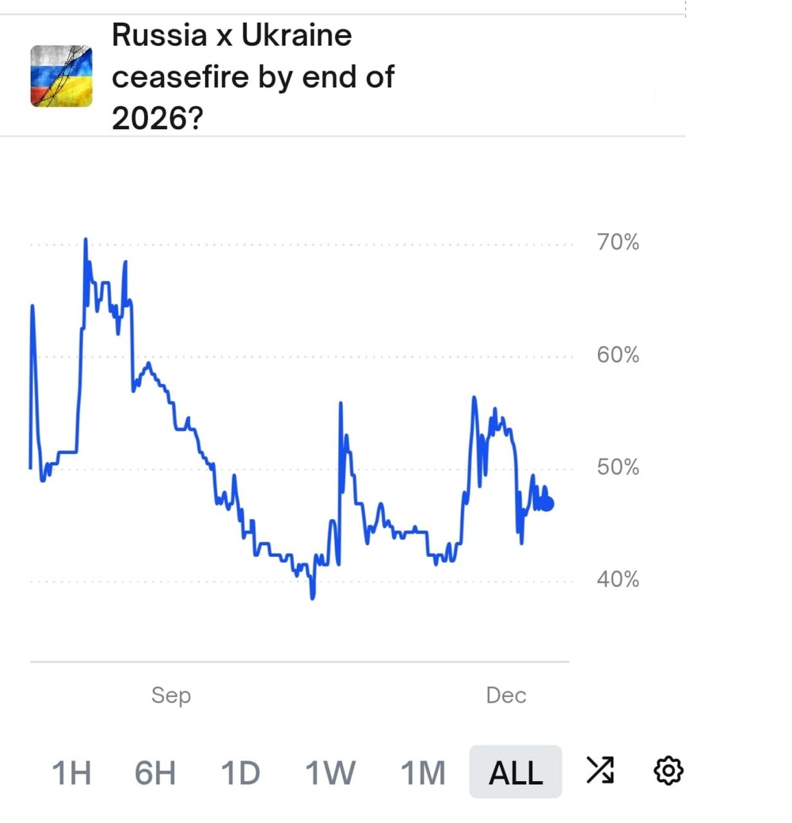 Особенность сегодняшнего роста акций Сегодняшний рост на рынке акций, думаю, связан с тем, что USDRUB снова приближается к 80 (USDRUBF уже 80) На Polymarket ставка на перемирие до 31 12 2026 колеблется 46 - 48%, не растёт как на Трампоралли Т.е. рост не связан с резким ростом надежд на приближение мира Также, когда надежды на окончание СВО, обычно растёт СПБ Биржа Сегодня хуже рынка ФРС вчера снизили ставку снова на 0,25% Вероятно, продолжат снижение и в 2026г. Трамп мечтает о ставке 1% Для США каждый 1% снижения ставки - это экономия $360 млрд в год на обслуживании долга. Я к тому, что цвет.мет. могут продолжить рост Из нефтегаза, в 1 очередь смотрю на Новатэк