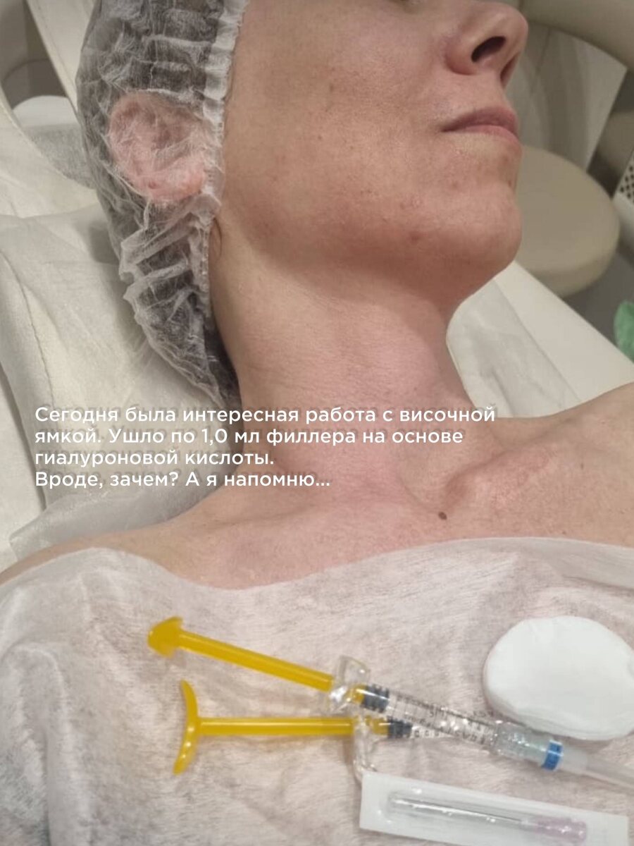 Работа с височной ямкой. 📌(Описание на фото) Нужна процедура не всем. Обязательно требуется консультация. Применяется филлер на основе гиалуроновой кислоты. Время процедура 10 минут. Инструмент: канюля. Объем препарата зависит от степени западения височной ямки.