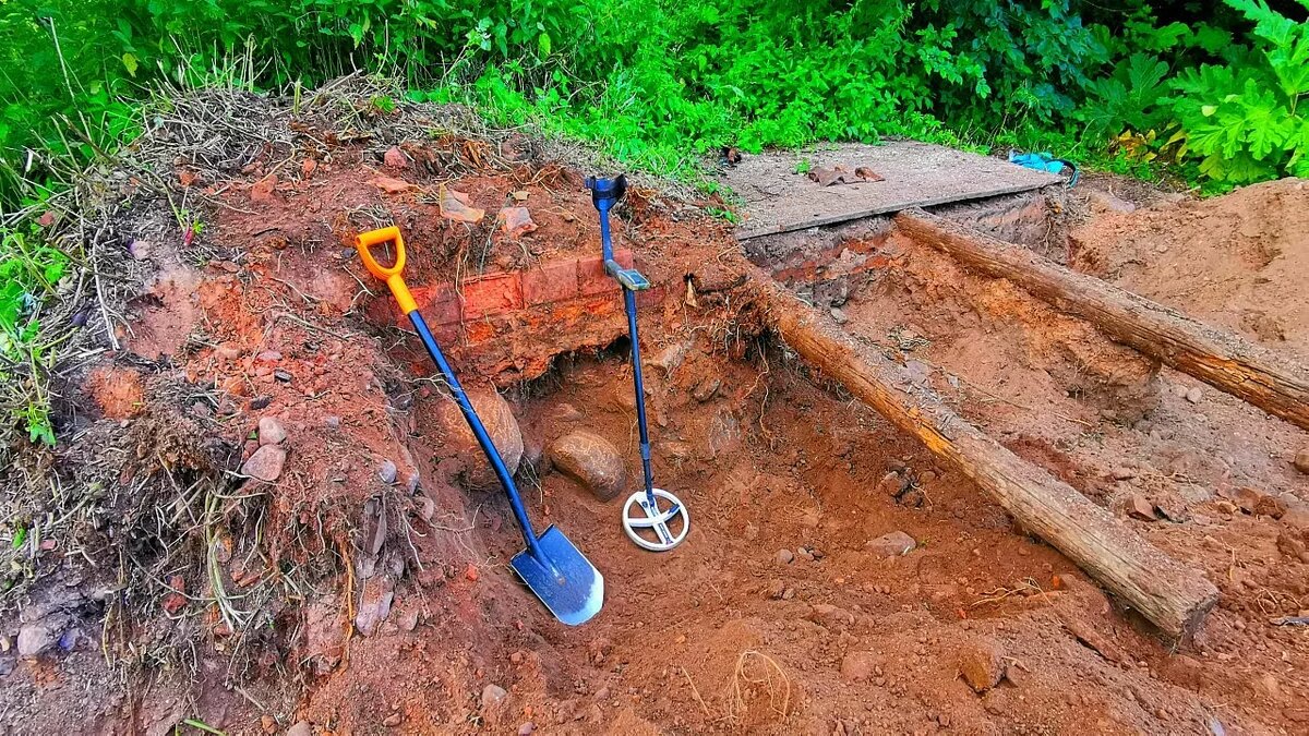 Но через полчаса Дима заметил странное: прибор начал давать частые чёткие отклики в одной точке — слишком плотные для случайного мусора. 🧱 Фундамент, спрятанный землёй Сняв верхний слой дерна, друзья увидели ровный угол старой кирпичной кладки.