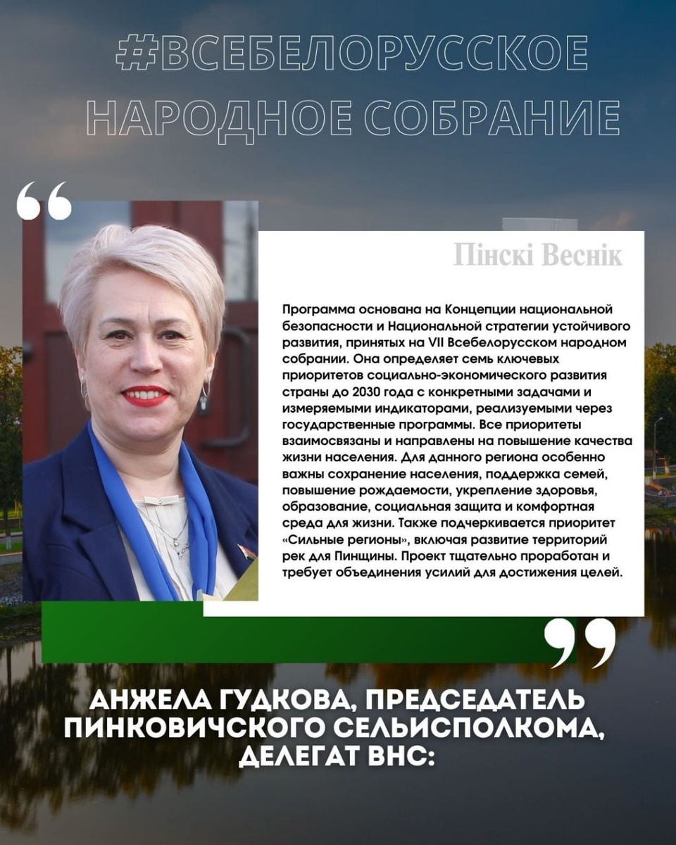 ⏬️◀️🔼🔽➡️⬅️⬇️ ➖Анжела Гудкова, председатель Пинковичского сельисполкома, делегат ВНС: - Лично для меня, как для делегата ВНС от местных органов самоуправления, очевидно, что все приоритеты взаимосвязаны и ведут к новому качеству жизни каждого белоруса, а значит, каждого жителя нашего сельсовета и района. 📱Ютуб 📱ВК 📱ИНСТАГРАМ 📱ОК 📱ФЕЙСБУК 📱ТИК ТОК Прислать новость