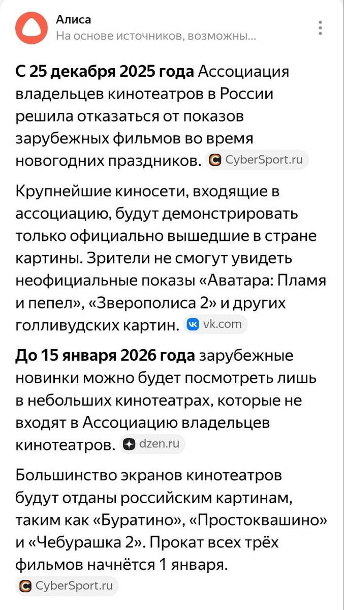 Ассоциация владельцев кинотеатров приостановит показ голливудских фильмов в новогодние праздники и будет показывать в Новый год только российские картины.