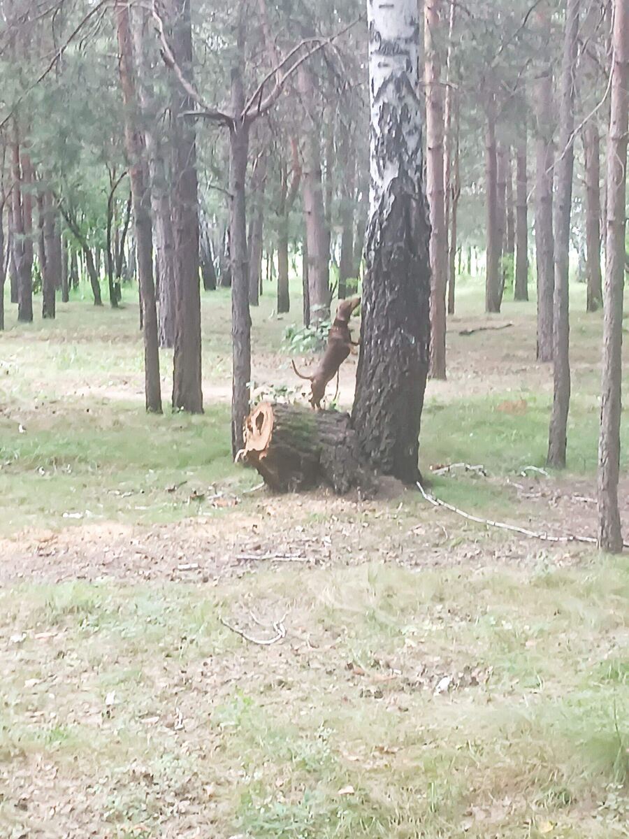 Пока я в командировке, а собаки дома. Листал старые фотографии и попалась Мишель на дереве. Так вот как начилась любовь Мишель к деревьям. Мишель росла как и всё таксы очень любопытной и любознательной. А в добавок ко всему и очень смелым и непослушным щенком. В 2020 году ( когда родилась Мишель) была очень тёплая осень. И мы с друзьями решили отметить последние выходные октября шашлыком в роще. Мишель естественно взяли с собой. Мишель вообще до рождения щенков везде ( кроме работы) всегда была со мной. Мишель сходу поняла что шашлык это вкуснятина. И конечно у всех его выпрашивала. А когда все её игнорировали, то пыталась украсть кусочик сама. Поэтому пришлось всё мясо убрать в пакет и поведать повыше на дерево. А так как Мишель отметившая накануне свои семь месяцев успела уже всех приучить своим исчезновением. Могла уйти за километр по своим делам, а потом так же спокойно появиться. Поэтому никто особо и не заметил, что собака залезла на дерево и пыталась сбросить пакет с мясом. Фо