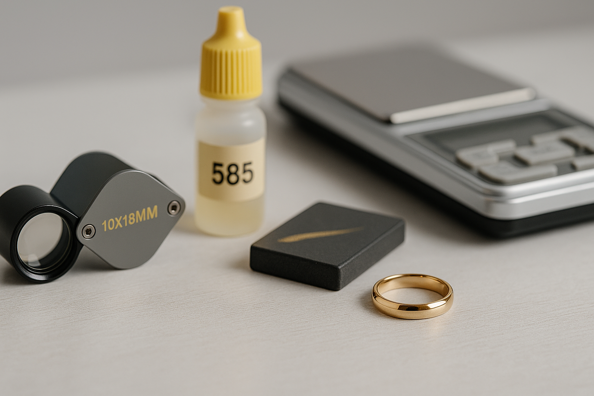 Сделайте лёгкий след на тест-камне и нанесите реактив нужной пробы (например, 585). Если след устойчив — проба соответствует; если растворяется — проба ниже заявленной. Никогда не капайте кислоту на само изделие. Работайте в перчатках и проветриваемом помещении. Этот метод ориентировочный и не заменяет приборную диагностику.