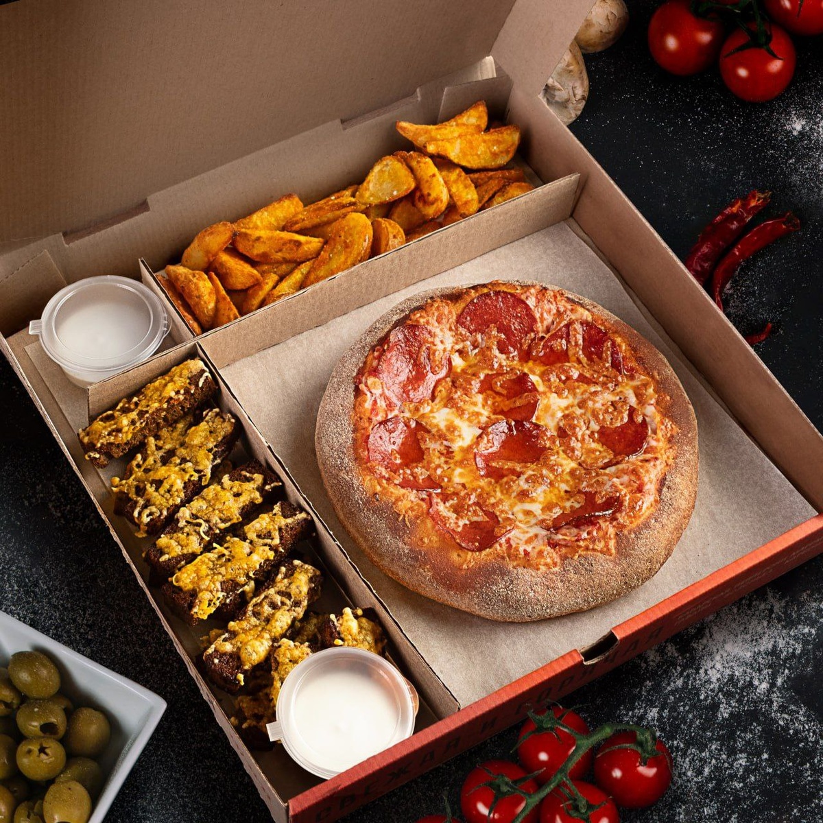 Пицца на ваш выбор в компании лучших закусок: картофельных долек и чесночных гренок. Всё самое главное для приятного вечера