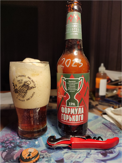Вы же помните симпозиум, на котором славные члены ВПК разбирали крепышей из Губахи? Тогда я выставил 3 образца 2023 года издания. А надысь, копаясь в закромах Родины, я обнаружил тогда затерявшуюся бутылочку... той самой ИПАхи - Формулы Горького! На том симпозиуме Формула от 2025 года выступила так себе, а что же выдержанная версия? Признаюсь, открывал я бутылку с некоторой опаской: мало ли что за такой срок с пивом может произойти, но... получилось не так уж и страшно. Правда пена, обильная, липкая, очень стойкая, мелкодисперсная, светло-кремовая лезла и лезла из бутылки, как биомасса в каком-то советском фантастическом фильме, так что налить так, чтобы в бокале было видно хоть сколь-нибудь жидкости, получилось не сразу. Но получилось. Но пену, лезущую из бутылки, таки пришлось несколько раз перемещать в отдельный бокал. Цвет пива янтарный, даже медовый, пиво прозрачное. Аромат плотный, вяленая цитрусовая корка, чуть изюма, совсем не ИПА, скорее что-то напоминающее Бельгию. Вкус н