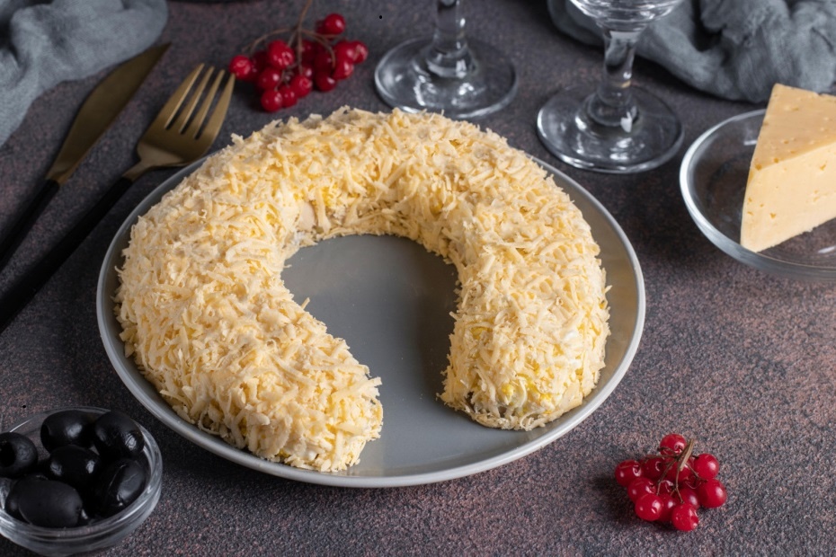 И конечно это вкусный салат для угощения за праздничным столом. Он делается в форме подковы, которая традиционно считается символом привлекающим удачу и достаток в дом. На новый год 2025 проходящий под покровительством Лошади этот салат будет актуален. Салат "Подкова" - рецепт к новому 2026 году Продукты подготавливаются заранее и потом салат собирается на красивом блюде. Делать его несложно, но потребуется аккуратность. Ингредиенты: Мякоть говядины отварная - 300-350 гр.; Картошка - 3 шт. средние.; Морковка - 1 крупная или 2 небольшие; Яйца - 4 шт.; Маринованный огурцы - 2 шт. маленькие.; Твердый сыр - 130-150 гр. Приготовление, как уже говорилось, очень несложное. Как делать салат "Подкова" Говядину нужно отварить в подсоленной воде и дать немного остыть. Пока теплая нарезать маленькими кубиками. Поделюсь "фишкой" - если нарезать мясо теплым, то оно останется мягким даже после полного остывания и добавления в салат. Отварить картошу и морковку не очищая, но не разваривать. Когда ос