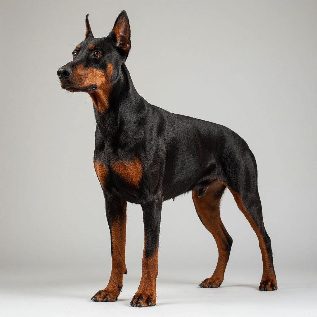 Доберман — крупная служебная порода собак атлетического телосложения. Происхождение: выведена в Германии, на территории Тюрингии, во второй половине XIX века; основоположник породы — Фридрих Карл Луис Доберманн; для выведения породы скрещивались немецкий пинчер, ротвейлер, немецкая овчарка, манчестерский терьер, а также гончие и доги; первоначально порода называлась «тюрингский пинчер» и «доберман-пинчер»; современное название получила в середине XX века. Основные характеристики: вес: самки — 32–35 кг, самцы — 40–45 кг; рост (высота в холке): самки — 63–68 см, самцы — 68–72 см; продолжительность жизни: 10–14 лет; окрас: чёрный или тёмно-коричневый с коричнево-красными подпалами, также встречаются голубой и изабелловый окрасы; длина шерсти: короткая, жёсткая, плотно прилегает к телу, подшёрсток не развит. Характер и повадки: энергичны и активны; обладают выраженным охранным инстинктом; при правильной социализации могут быть доброжелательны в семье и не агрессивны к домашним, включая д