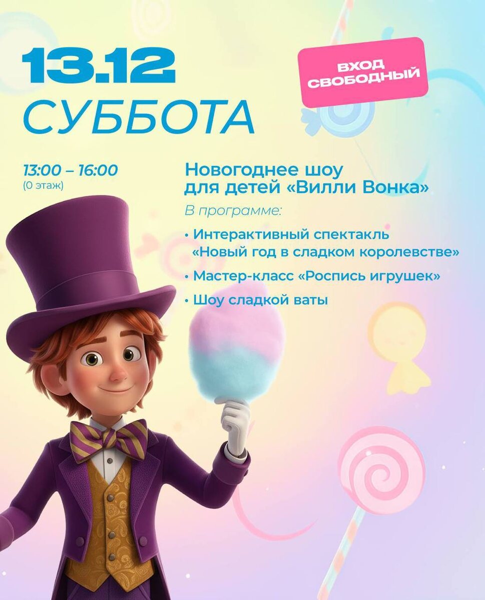 🆓Ощущение праздника в «Щёлковском» становится всё ярче с каждым днём в @schelkovsky☃️🎄 📍ТРЦ «Щелковский» Декабрьские выходные здесь напоминают добрую сказку: можно окунуться в сладкое приключение с Вилли Вонкой, разделить уютный миг чтения с пушистыми терапевтами или помериться стратегией на праздничном шахматном турнире. 🗓️Суббота (13 декабря) 🍫13:00 – 16:00 – Новогоднее шоу для детей «Вилли Вонка» (0 этаж) В программе: • Интерактивный спектакль «Новый год в сладком королевстве» • Мастер-класс «Роспись игрушек» (до 120 чел., вход группами по 10 чел. каждые 10 мин.) • Шоу сладкой ваты 🐶14:00 – Чтение с собаками в «Читай-городе»: проект канис-терапии совместно с фондом помощи бездомным животным «Добро Вместе» (4 этаж) 🗓️Воскресенье (14 декабря) Развлекательная программа для детей (4 этаж, зона мастер-классов): ⚡️12:00 – 13:00 – Кукольный спектакль «Как снеговик солнышко спас» ⚡️12:00 – 14:00 – Мастер-класс: поделка из фетра «Пингвиненок-значок» ⚡️12:00 – 14:00 – Б
