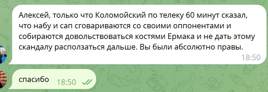 ☝️Говорят Коломойский подтверждает... НАБУ вошло в договорнячок... Надеюсь Зелю они всё таки кинут. Есть такой приём у спецслужб "усыпить бдительность" и потом ударить в самый интересный момент. Но поведение Зели это всё таки объясняет... ☝️Единственный канал где об этом говорилось заранее, просто исходя из логики поведения сторон :)