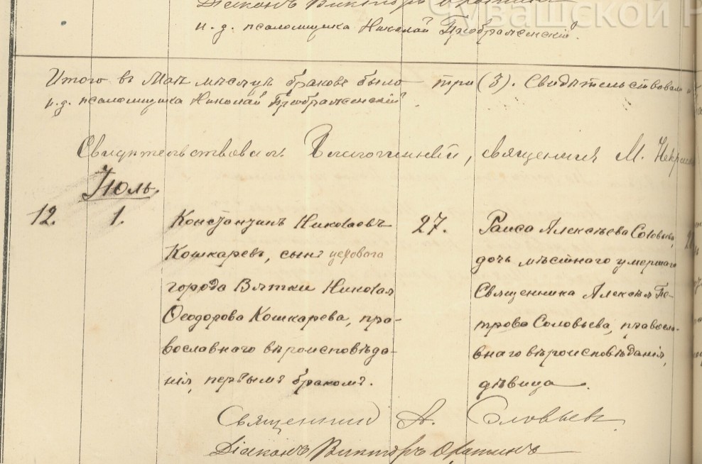 Село Кушниково. Метрическая книга о бракосочетавшихся за 1891-1917 гг. ГИА Чувашской Республики (ГИА ЧР), фонд № 557, опись № 8, дело № 134, стр. 222 скан. Метрическая книга, данная из Казанской Духовной Консистории в Спасопреображенскую церковь села Кушникова Чебоксарского уезда для записи родившихся, браком сочетавшихся и умерших на 1912 год. Часть вторая. О бракосочетавшихся. Июль. № 12. 1 числа. Жених: Константин Николаев Кошкарев, сын цехового города Вятки Николая Феодорова Кошкарева, православного вероисповедания, первым браком. 27 лет. Невеста: Девица Раиса Алексеева Соловьева, дочь местного умершего священника Алексея Петрова Соловьева, православного исповедания, девица. 18 лет. Поручители: по женихе: мещанин города Уржума Вятской губернии Александр Александров Шестаков и Греческий поданный Антоний Георгиев Алафузов; По невесте: Цивильского уезда села Багильдина псаломщик Александр Молчанов и студент Казанского ветеринарного института Вячеслав Талызин. Венчание совершил: св