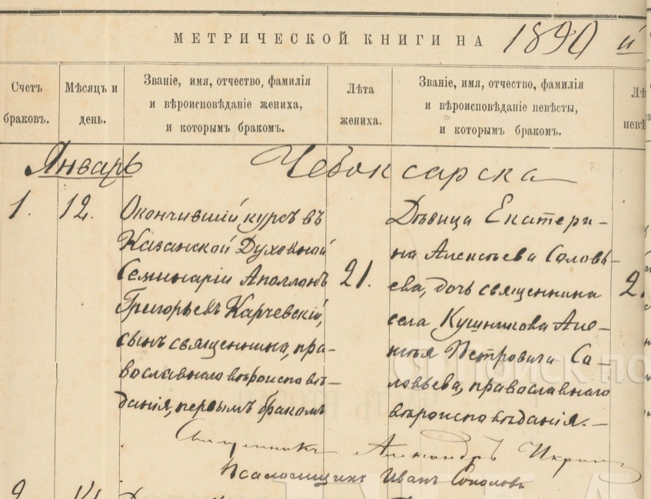 Село Кушниково. Метрическая книга о бракосочетавшихся за 1871-1890 гг. ГИА Чувашской Республики (ГИА ЧР), фонд № 557, опись № 8, дело № 133, стр. 140 скан. Метрическая книга, данная из Казанской Духовной Консистории в Спасопреображенскую церковь села Кушникова Чебоксарского уезда для записи родившихся, браком сочетавшихся и умерших на 1890 год. Часть вторая. О бракосочетавшихся. Январь. № 1. 12 числа. Жених: Окончивший курс в Казанской духовной семинарии Аполлон Григорьев Карчевский, сын священника, православного вероисповедания, первым браком. 21 года. Невеста: Девица Екатерина Алексеева Соловьева, дочь священника села Кушникова Алексея Петровича, православного исповедания. 21 года. Поручители: по женихе: местный учитель села Кушникова Николай Степанов Андреев и купеческий сын Арсений Трофимов Зинин; По невесте: священник села Алманчино Кир Григорьев Карчевский и села Алексеевского священник Никандр Григорьев Карчевский. Венчание совершил: священник села Сотникова Александр Алекса