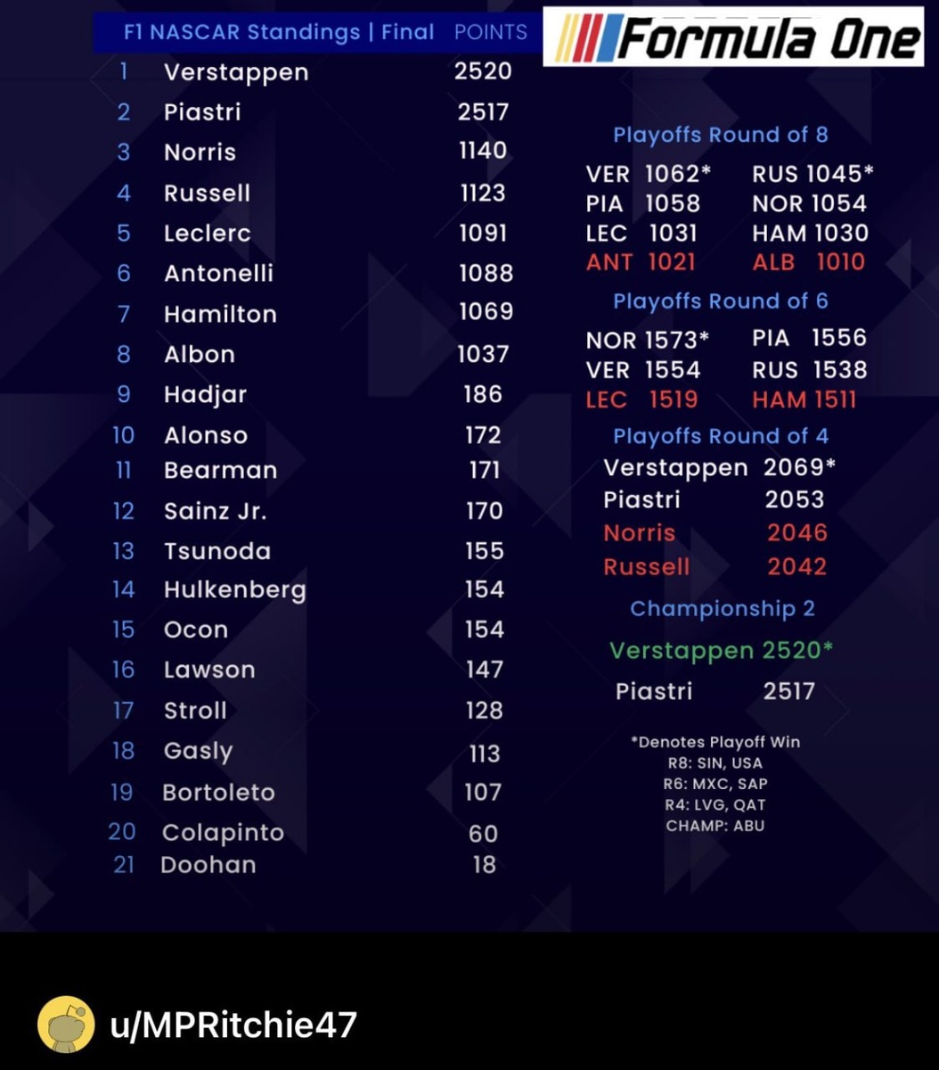 Чемпионат Формулы 1 2025 года, если попытаться адаптировать его под правила Наскара с плей-офф системой