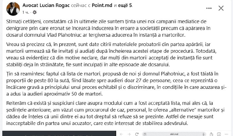 Адвокат Лучиан Рогак, представляющий интересы бывшего лидера Демократической партии Владимира Плахотнюка, выступил с заявлением, в котором отверг обвинения в намеренном затягивании судебного разбирательства. Защитник назвал происходящее в медийном пространстве кампанией по дезинформации общественности. Юрист пояснил, что в данный момент задержка вызова свидетелей обусловлена процедурными этапами, а не злым умыслом защиты. Сейчас в суде идет оглашение доказательных материалов, и только после завершения этой стадии начнется допрос свидетелей. При этом Рогак отметил сложности с явкой людей: многие из утвержденного списка либо находятся за границей, либо сами являются обвиняемыми по другим эпизодам дела. Особое внимание Рогак обратил на дисбаланс в количестве свидетелей, допущенных судом. По словам адвоката, инстанция отклонила подавляющее большинство ходатайств со стороны Плахотнюка, создав неравные условия по сравнению с прокурорами. «Список свидетелей, предложенный нами, был урезан б