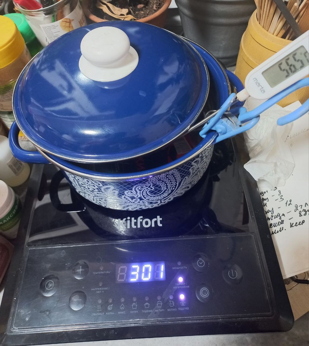 #сувид в процессе Готовый полуфабрикат филе утиной грудки в восточном маринаде (куплено в Озон фреш) t=56-58°С, время 3 часа. Минусы индукционной плиты - надо следить за температурой и периодически уменьшать/увеличивать нагрев. Зато можно сделать всего один пакетик😉 В сувиднице проще - выставил температуру и таймер и забыл до окончания процесса, но там нужна вода из водомата, наша из крана не подходит, слишком большой осадок.
