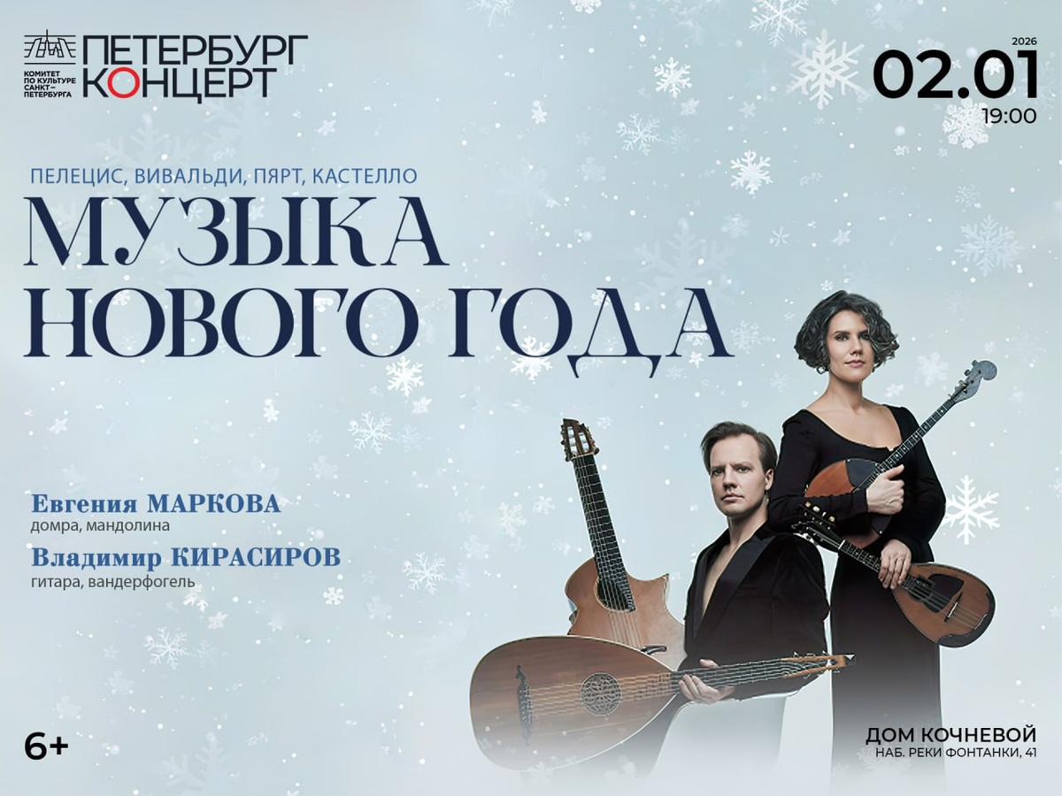 2 января в Доме Кочневой вас ждет виртуозное барокко, медитативный минимализм и современная классика в исполнении Евгении Марковой и Владимира Кирасирова! Центральное место в программе занимает произведение Георга Пелециса «New Year's Music», наполненное светлой меланхолией и надеждой, идеально отражает атмосферу нового начала и служит эмоциональным камертоном всего вечера. Также в этот вечер зрители смогут услышать будут исполнены сочинения Антонио Вивальди, Арво Пярта и Дарио Кастелло. Евгения Маркова и Владимир Кирасиров — музыканты из Санкт-Петербурга, уже боле 15 лет исполняющие старинную музыку в оригинальных аранжировках, а также произведения композиторов-метамодернистов. Участники международных конкурсов и фестивалей, обладатели гран-при конкурса Golden Key в Бостоне и лауреаты международного конкурса в Омише, Хорватия. БИЛЕТЫ: 02.01 | 19:00 | Музыка Нового года