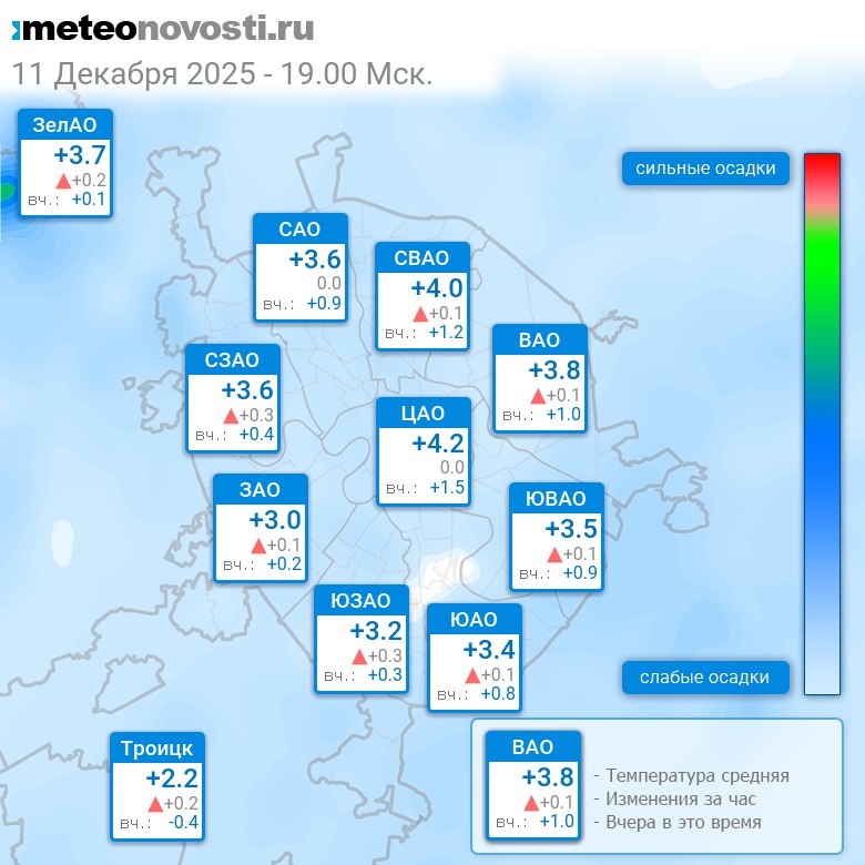 В 19:00 в Москве было от +2.2°C до +4.8°C, средняя температура +3.6°C #погода #Москва #зима #температура #11декабря #четверг