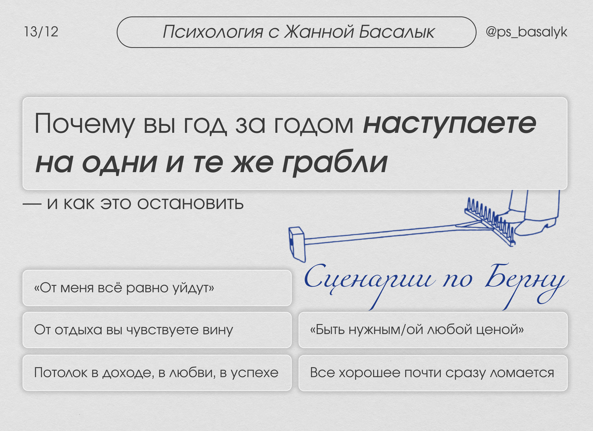 Вы снова оказались в знакомой ловушке: тот же тип партнёра, та же работа, те же деньги — и тот же исход. Это не случайность и не «плохая удача». Чаще всего это — жизненный сценарий, бессознательный план, записанный в детстве, который до сих пор диктует выборы и реакции. Сценарий по Берну - это устойчивая «инструкция» о том, как жить, кем быть и чего ожидать от мира — сформированная на основе родительских фраз, семейных ролей и ранних опытов. Почему сценарии удерживаются Сценарии закрепляются через повторяющееся поведение и подтверждающие события: ребёнок принимает «решение» семья подкрепляет мозг ищет доказательства — и паттерн становится автоматизмом. Что важно: психотерапевтическая работа действительно меняет поведенческие и нейронные пути — это подтверждают исследования по эффектам терапии на функционирование мозга и нейропластичности. То есть: мозг можно переобучить. Популярные сценарии 1) «Не слишком счастливо» — страх радости, самосаботаж успеха Что внутри: установка «слишком
