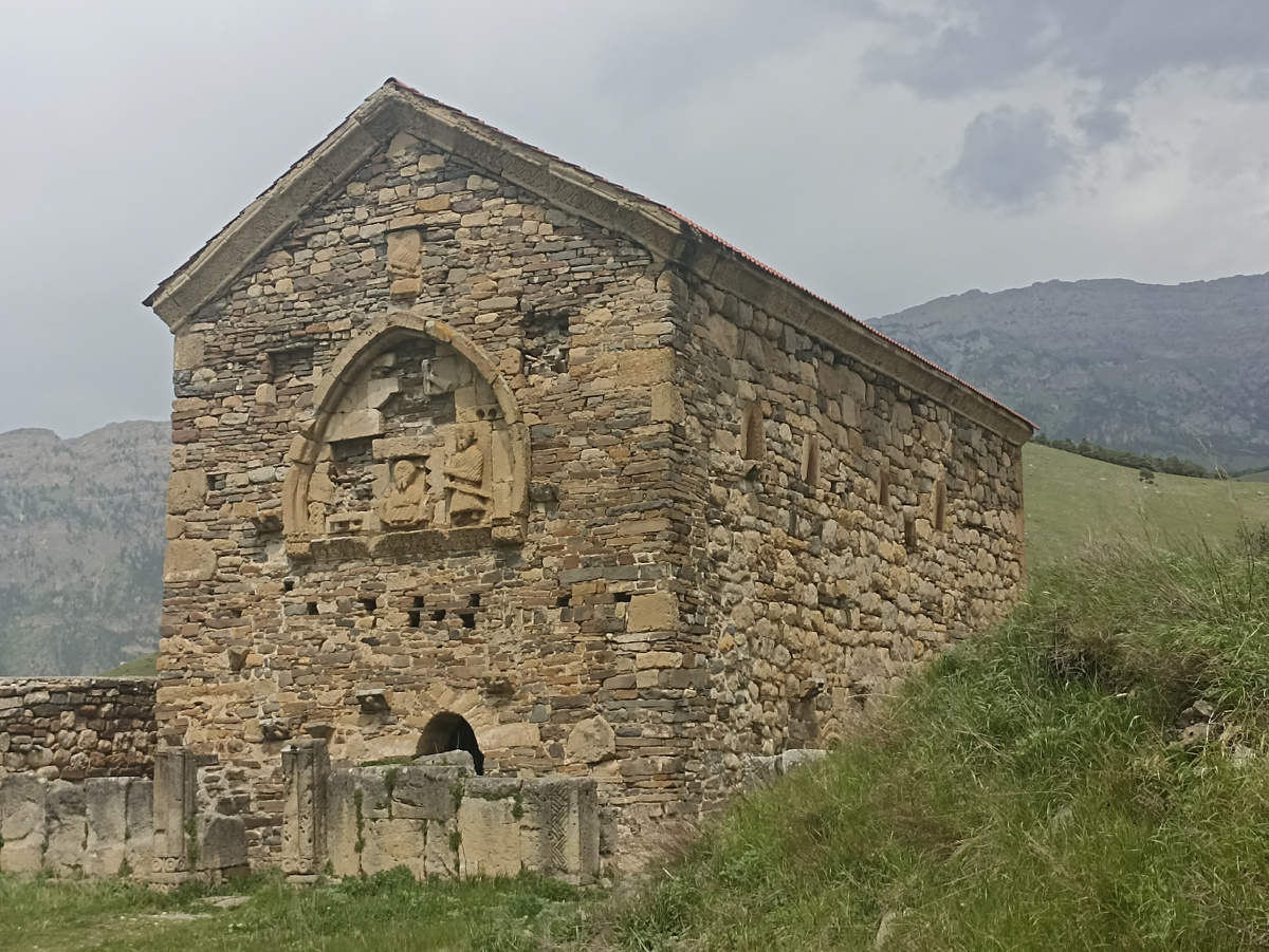 Храм несколько раз перестраивали, и в XV веке ингушские мастера, не особо разбираясь в первоначальном замысле, ставили каменные блоки с рельефами куда попало. Из-за этого сцена охоты святого Евстафия оказалась «разорвана» на две разные стены. Это не ошибка, а след бурной истории (ну не заморачивались раньше при реставрации– как поставили, так и стало). Захотелось посмотреть, как храм выглядел до реставрации (см. фото).