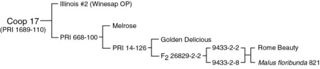 Родословная (PRI 1689-110 = рисунок № 2 («Winesap» op) x PRI 668-100) (Williams et al. 1975) Краткое описание. Плоды: 70–76 мм (2–3/4–3 дюйма); короткоконические до слегка сплющенно-конических; яркие, гладкие, без ржавчины; с оранжевым румянцем, 100% собственные, бледно-желтые с незаметными чечевичками, привлекательные; толстая жесткая кожура; мелкозернистая, бледно-желтого цвета, очень плотная, умеренно жесткая, хрустящая мякоть; сладкий до слегка кисловатого, слегка ароматный, мягкий вкус; сочные. Обильный однолетний урожай. Плоды очень хорошо держатся на дереве. Сохраняют качество в течение шести месяцев и более при хранении в холодильнике. При обильном урожае плоды, как правило, слишком мелкие, если их не прореживать. Дерево: умеренно сильнорослое; меньше среднего размера; умеренно шпорцевое, с некоторой склонностью к пониканию ветвей; некоторая склонность к плодоношению на верхушках, местами голая древесина у оснований ветвей. Устойчивость к болезням: Полевой иммунитет к парше я