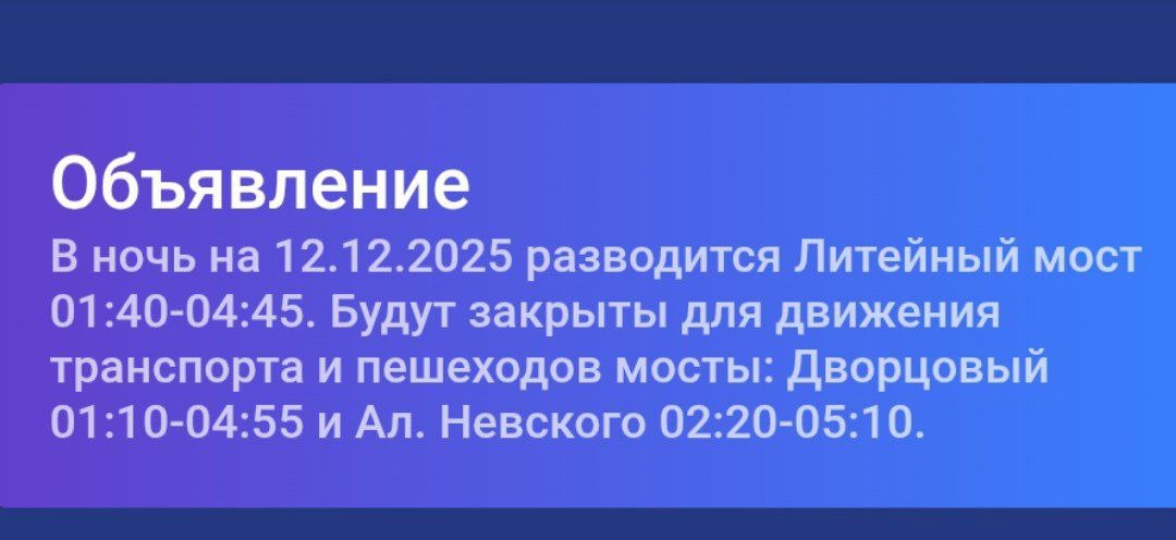 ❗️Сегодня ночью на пятницу 12 декабря разводят мосты: ❌ Дворцовый 1:10 - 4:55 ❌ Литейный 1:40 - 4:45 ❌ А.Невского 2:20 - 5:10 👉 #Высокий_Спрос. Подписаться #работа, #вакансия, #заработок, #деньги, #подработка, #работасейчаc, #водитель, #водителю, #работаводителем, #такси, #таксист, #работавтакси, #курьер, #работакурьером, #доставка, #доставкаеды, #ЯндексЕда, #DeliveryClub, #ЯндексТакси, #Ситимобил, #ЯндексРабота, #Таксиру, #Uber, #UberEats, #GetTaxi, #авто, #автомобиль, #работанаавто, #работанаавтомобиле,, #арендаавто, #такспарк, #ищуработу, #вакансии