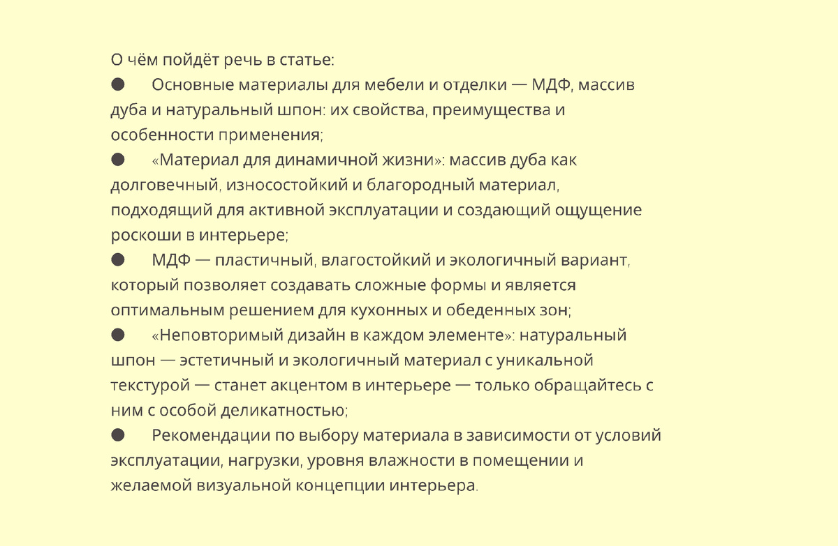 В современном дизайне интерьера выбор материалов для мебели и отделки — это не только вопрос эстетики, но и функциональности, долговечности и экологичности. Тремя наиболее популярными материалами, широко применяемыми в производстве, являются массив дуба, МДФ и натуральный шпон. Каждый из них имеет свои уникальные свойства и преимущества. Рассмотрим эти варианты подробнее в статье. Материал для динамичной жизни — массив дуба Массив дуба — это натуральная твёрдая древесина, отличающаяся исключительной прочностью, высокой износостойкостью и благородностью. Мебель из дуба ценится за долговечность: она отлично выдерживает активную эксплуатацию, не боится нагрузок и десятилетиями сохраняет эстетичный внешний вид. Разнообразие оттенков данного материала — от светлого медового до глубокого шоколадного — позволяет использовать его в интерьерах любых стилей: от сканди до классики. Стоит отметить, что массив дуба всё же требует регулярного ухода — при правильной обработке он прослужит вам долги