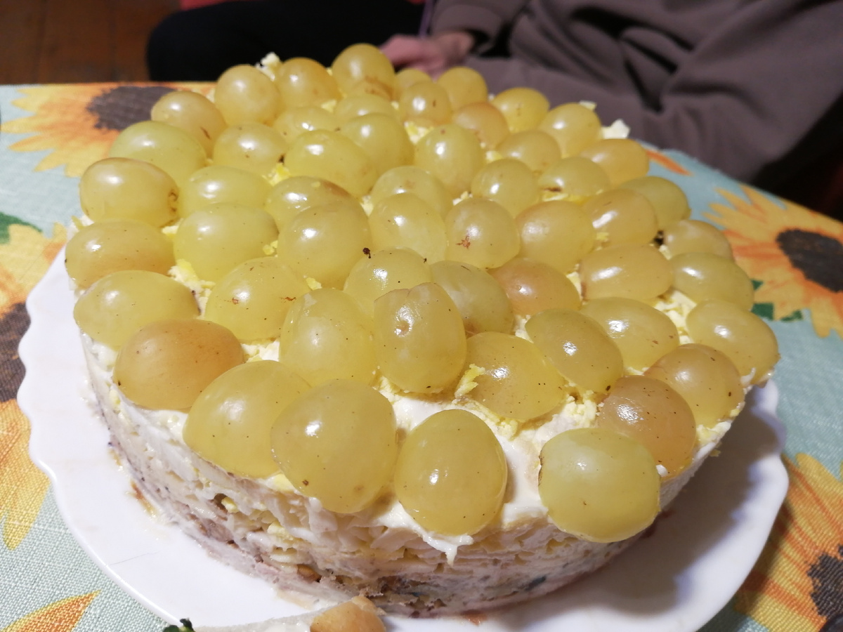 Друзья, рецепт салата можно найти на многих ЮТ каналах и просто в интернете. Но многие не воспринимают салаты с использованием фруктов или ягод. Кому то не нравится сочетание сладкого и мясного. Но поверьте, это вкусный и сочный салат. Пишу рецепт по просьбе подписчицы и так, как готовлю его я. И естественно на авторство не претендую. Ингредиенты : Виноград белый, розовый или чёрный, небольшая кисточка. Но виноград лучше брать без косточек и тёмный. Он смотрится более выиграшно и вкус у него ярче, чем у киш миша. Тайфи неплохой, мясистый виноград, но там надо косточки вынимать. Яйца - 3 шт, Сыр-150 грамм, Сыр и яйца натереть на крупной терке. Орехи-100,150 грамм. Орехи прокалить на сковороде, если кожура снимается, то очистить и порубить мелко, но не в пыль. Орехи все же должны чувствоваться. Курица, можно филе, можно бедро. Бедро даже лучше, оно более сочное чем грудка. И мясо по желанию, можно отварить, можно обжарить, можно взять копченое. Мяса куриного, по объёму с