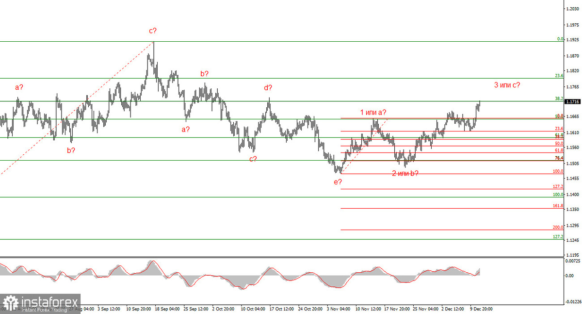 Волновая разметка 4-часового графика для инструмента EUR/USD преобразилась, но в целом имеет вполне понятный вид. Об отмене повышательного участка тренда, который берет свое начало в январе 2025 года, речи не идет, но волновая структура, начиная с 1 июля значительно усложнилась и приняла более протяженный вид. На мой взгляд, инструмент завершил построение коррекционной волны 4, которая приняла очень нестандартный вид. Внутри этой волны мы наблюдали исключительно коррекционные структуры, поэтому сомнений в коррекционном характере снижения не возникало никаких. На мой взгляд, построение повышательного участка тренда не завершено, а его цели разбросаны вплоть до 25-й фигуры. Серия волн a-b-c-d-e выглядит завершенно, следовательно, я в ближайшие недели ожидаю построения нового повышательного набора волн. Мы увидели предполагаемые волны 1 и 2, а сейчас инструмент находится в стадии построения волны 3 или с. Я ожидал, что в рамках этой волны инструмент повысится до отметки 1,1717, что при