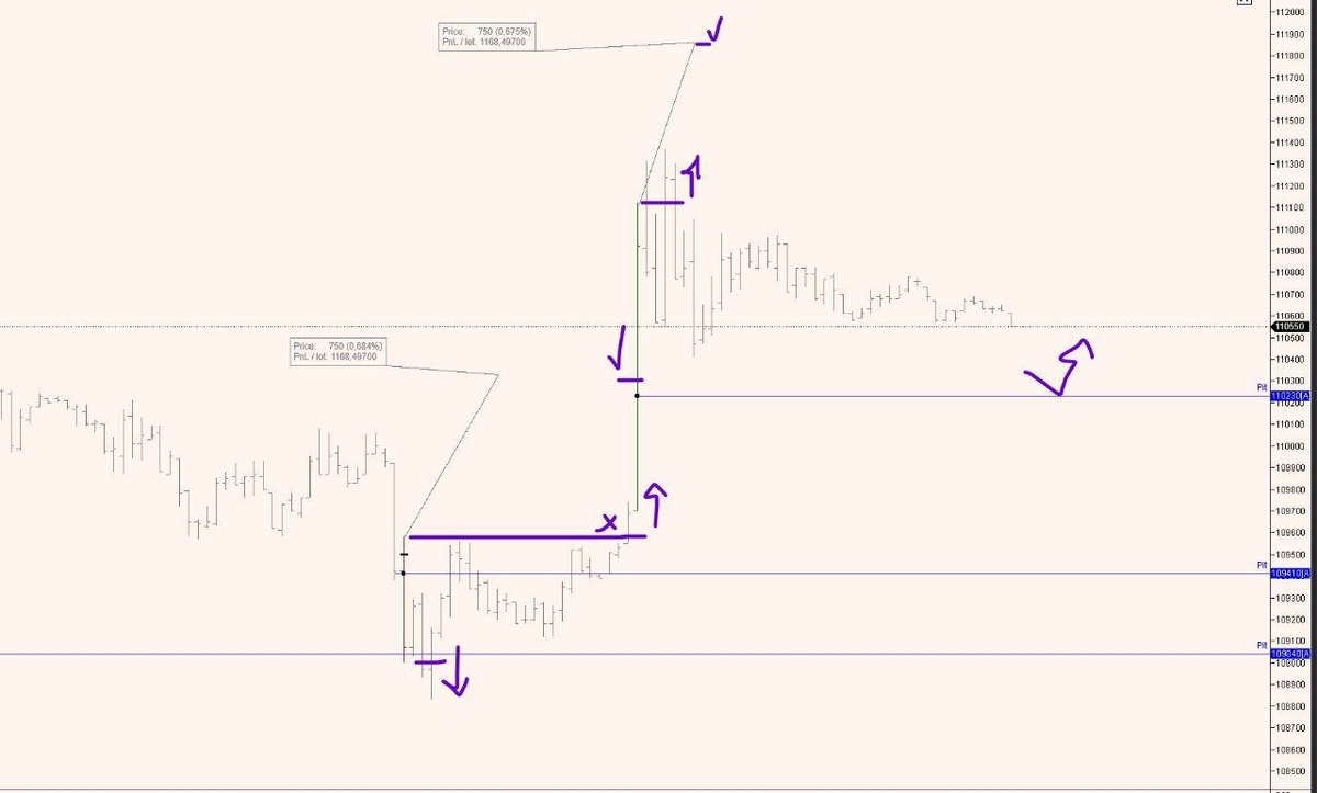 График Ри, тф 2 мин. Сегодня было два сигнала стратегии 750. 1️⃣ Первый сигнал — продавец. После акцепта цена не дошла до цели, последовал переворот, и уже в противоположную сторону мы цель выполнили. По стратегии итог таков: –580 + 750 = +170 пунктов. Если успеть закрыться на самом уровне цели — получалось ровно так. А если чуть «замешкаться» на импульсе, то там и случайные +750 можно было прихватить — движение было резкое 😉 2️⃣ Второй сигнал получил акцепт, бар был очень крупный — порядка 1400 пунктов. Такие бары, особенно сразу после клиринга, опасно отрабатывать: стоп получается огромным. Но! Есть уровень PIT — отмечен на графике. И это интересная точка для локальной сделки, независимо от величины бара. Не ИИР