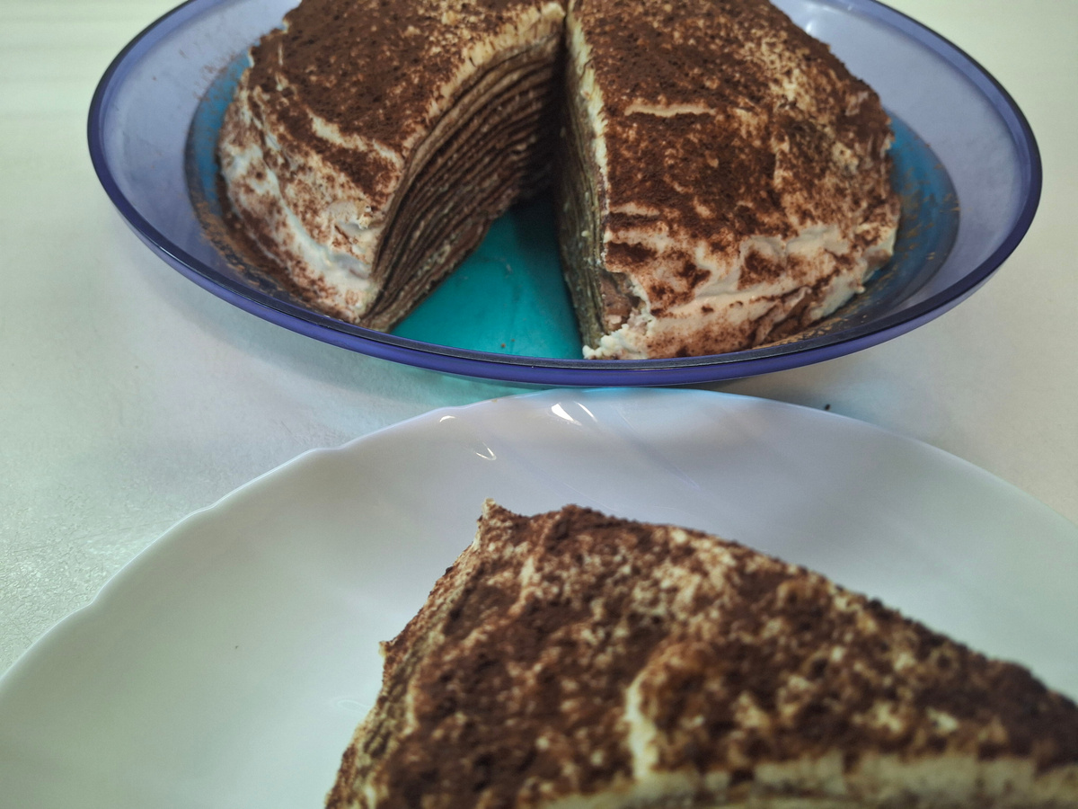 Отличная альтернатива оригиналу Тирамису. Состав: Для блинов: 2 яйца (1с); 45 гр. сахара; 250 гр. молока; 10 гр. какао порошка; 160 гр. муки; 3 гр. соды; 2 ст.л. растворимого кофе + 250 гр. кипятка ИЛИ 3 ч.л. зёрен кофе и 300 мл. кипятка. Крем: 400 гр. сливок 33-35%; 340 гр. маскарпоне (творожного сыра, без добавок); 150 гр. сахарной пудры; 2 гр. ванилина. Приготовление: Какао я сразу просеяла через сито в муку (поэтому на фото нет). Смешиваем яйца с сахаром. Добавляем ½ молока, взбиваем. Добавляем соду и муку с какао, постепенно. Получается густое тесто (так легче размешать, чтоб не было комочков). Теперь добавляем оставшееся молоко, перемешиваем. Затем делаем кофе. Можно растворимый. Я варю из зернового в турке, так ароматнее! Измельчаю 3 ч.л. (с горкой) прожаренных зёрен. Выкладываю в турке, ставлю на медленный огонь, добавляю щепотку соли и прогреваю 20-30 секунд. Затем добавляю 300 мл. воды (не кипячёной) комнатной температуры. На медленном огне довожу до кипени