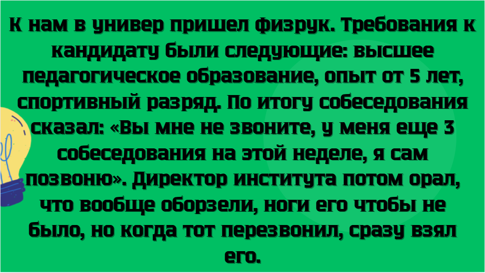 Собеседование — это настоящее испытание. Нужно быстро и точно отвечать на вопросы рекрутера, демонстрируя свое превосходство над другими кандидатами. И при этом важно сохранять уверенность и достоинство, особенно если беседа неожиданно выходит за рамки привычного сценария. Рекомендуем также заглянуть сюда 👇👇👇 Собеседование. Сижу в официальной одежде. Вся такая умная, интеллигентная. И тут у меня чешется грудь! В самый неподходящий момент. Руководитель (женщина) увидела, что мне некомфортно. Естественно, спросила, что происходит. Я призналась. Она рассмеялась и на работу приняла. Меняю работу не часто. Как правило, иду на новое место, так как на старом уже некуда расти. Сейчас моя третья работа, и, хотя я устраивался по знакомству, в резюме не скромничал. Зарплату поставил больше, чем мне могли предложить, и об этом знал. При собеседовании с руководителем по телефону также внаглую говорил, что маловато предлагают (хотя было заметно больше, чем на прошлой работе). По итогу у меня за