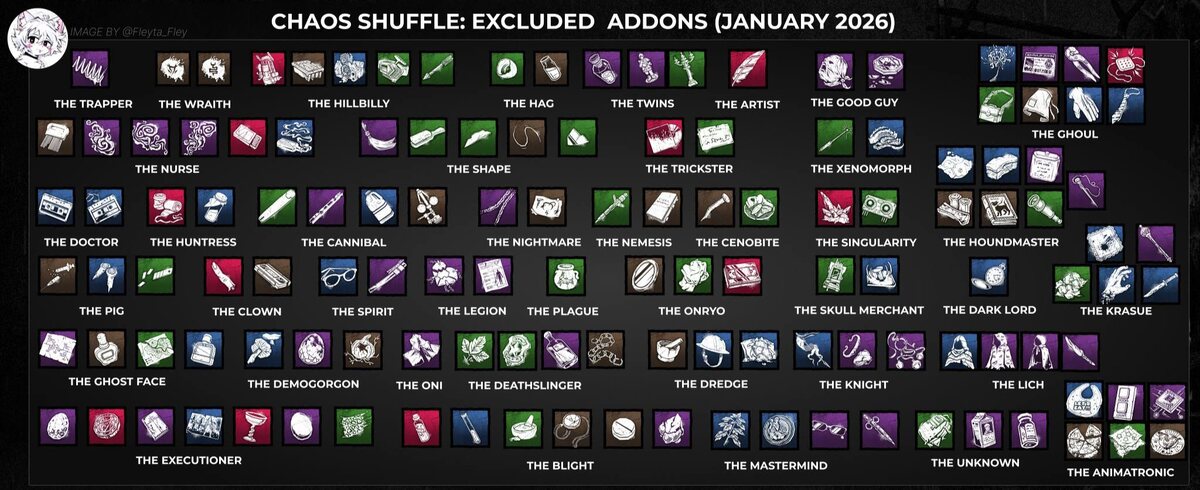 ❕❌ Визуальный список дополнений, исключенных из предстоящего модификатора «Хаотичное перемешивание» Хаотичное перемешивание вновь войдет в игру 13 января 2026 года 🔪 Подписаться | ⚡️Голосовать #deadbydaylight #дбд #dbd #news #dbdnews #новостидбд #новыйгод #зимадбд #eventdbd #bonechill #chaosshuffle
