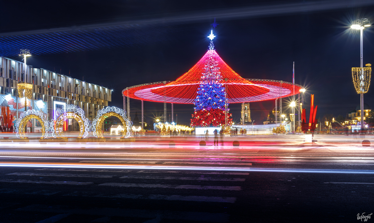 Обычно в провинциальных городах новогодняя ёлка — это такой скромный зелёный конус с гирляндой, который много лет подряд неизменно ставят на главной площади, обычно где-нибудь рядом с памятником Ленину. Максимум — добавят пластиковых шаров и парочку арок для прохода. Собственно, в Туле долгие годы так и было. Меняешься ты, меняется город вокруг, а ёлка — всё та же, почти родная в своей предсказуемой простоте. Но 2026-й год в Туле решили начать громко. И теперь на площади стоит ёлка, глядя на которую хочется уточнить: это точно наш город? Или мы попали на какое-то европейское рождественское шоу? Главная городская ёлка в этом году — 32 метра высотой. Но даже это не главное. Её накрывает шатёр из мультимедийной гирлянды диаметром 60 метров, и в тёмное декабрьское небо он раскрывается, как светящийся купол какого-то новогоднего космопорта. Огни постоянно меняются, переливаются волнами, рисуют узоры — иногда кажется, что стоишь внутри гигантской световой короны. Организаторы заявили, ч