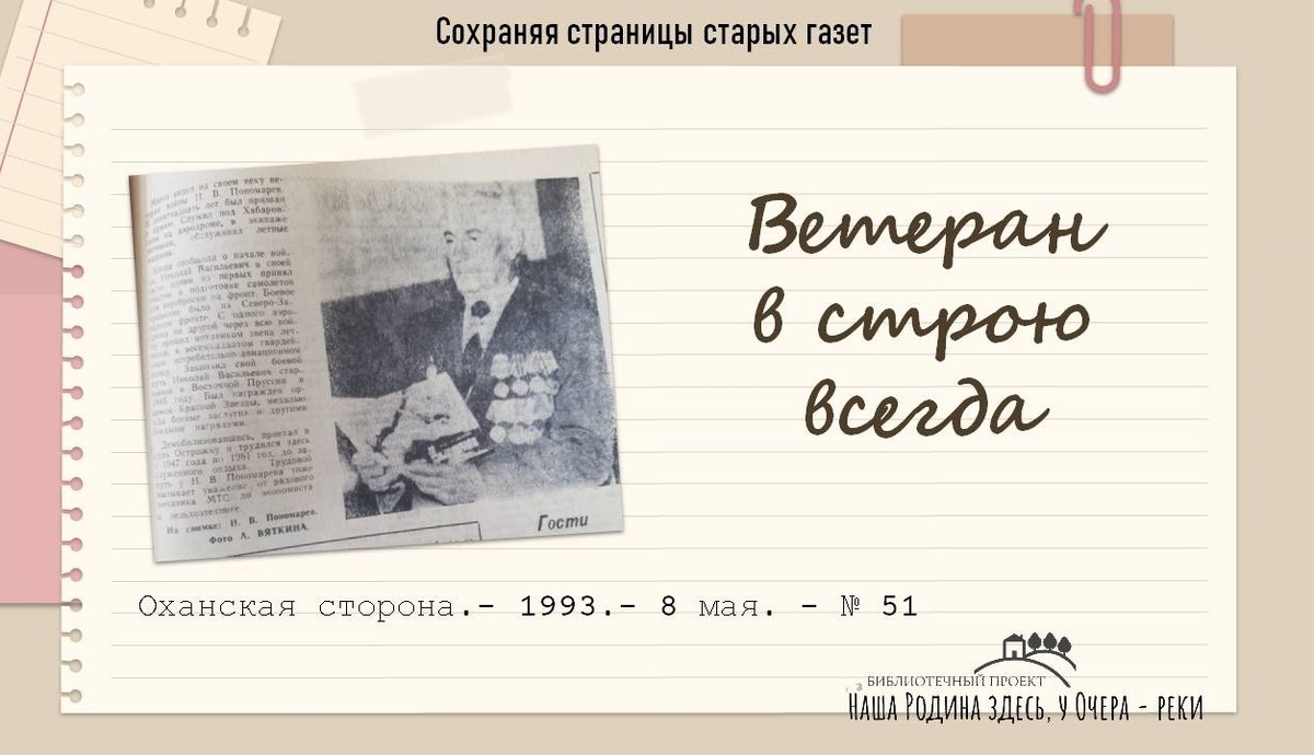 Оханская сторона.- 1993.- 8 мая. - № 51 Ветеран войны Николай Васильевич Пономарев повидал многое. В девятнадцать лет его призвали в армию. Служил он под Хабаровском на аэродроме, в экипаже летчиков, обслуживая боевые машины. С началом войны Николай Васильевич одним из первых в своей части готовил самолеты для переброски на фронт. Его боевое крещение состоялось на Северо-Западном фронте. Всю войну он прошел механиком звена летчиков, переезжая с одного аэродрома на другой в составе восемнадцатого гвардейского истребительного авиационного полка. Закончил свой боевой путь старшиной в Восточной Пруссии в 1945 году. Был награжден орденом Красной Звезды, медалью «За боевые заслуги» и другими боевыми наградами. После демобилизации Николай Васильевич приехал в село Острожку, где трудился с 1947 по 1981 год, до заслуженного отдыха. Его трудовой путь также вызывает уважение: от рядового механика МТС до экономиста в сельхозтехнике. На снимке: Н. В. Пономарев. Фото А. Вяткина.