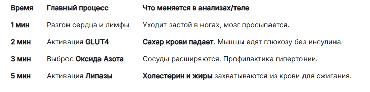 Статьи написаны на основе открытых источников и научных исследований. Информация носит ознакомительный характер и не заменяет консультацию врача. Организм каждого человека индивидуален, поэтому любые изменения в питании или лечении требуют консультации со специалистом. Идея в том, что даже 1-5 минут активности запускают мощнейшие биохимические каскады. Организму не обязательно бегать час, чтобы «включиться». Вот подробная раскладка по минутам: что происходит с вашей биохимией и маркерами, когда вы встаете с дивана и начинаете бежать на месте (или интенсивно маршировать). 1-я минута: «Сигнал тревоги и пробуждение» Эффект: Мгновенный выход из спячки. Как только вы начинаете двигаться, мышцы посылают сигнал в мозг: «Нам нужна энергия прямо сейчас!». Биохимия: