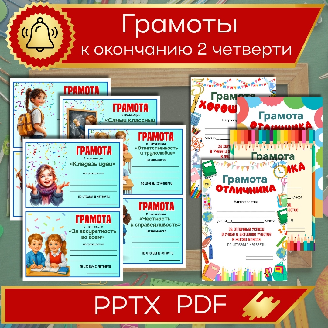 Готовый комплект грамот для награждения учеников по итогам 2 четверти. Подходит для проведения школьных линеек, классных часов, родительских собраний и праздников перед зимними каникулами.