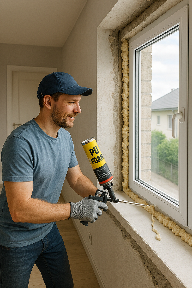 Это классическое и самое массовое применение. Пена выполняет сразу три функции: фиксирует раму в проеме, заполняет монтажный зазор и герметизирует его, обеспечивая тепло- и звукоизоляцию. Для этих работ критически важна пена с низким вторичным расширением, чтобы не деформировать раму. Современный стандарт качества (например, по RAL) предполагает не просто запенивание шва, а создание «теплого монтажного шва». Он включает в себя заполнение пустоты пеной, укладку пароизоляции с внутренней стороны и нанесение снаружи паропроницаемого, но гидрофобного герметика для защиты пены от ультрафиолета и влаги.