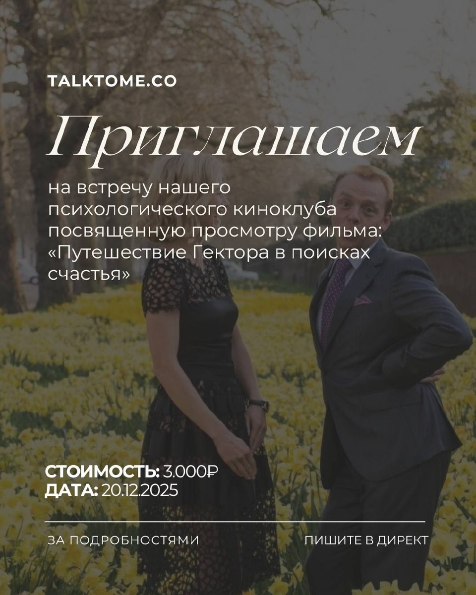 Дорогие друзья!❤️ Мы рады пригласить вас на встречу нашего психологического киноклуба, посвященную просмотру и обсуждению глубокого и трогательного фильма «Путешествие Гектора в поисках счастья» («Hector and the Search for Happiness», 2014) 🟣Этот жизнеутверждающий фильм станет прекрасным переходом к Новому году, ведь он позволяет остановиться, оглянуться назад и заглянуть внутрь себя. Вы сможете поразмышлять вместе с героями над темами быта, работы, отношений, которые делают нас счастливыми, определить, что стоит оставить позади, а чему посвятить больше внимания впереди. Героем истории является доктор Гектор, решивший отправиться в необычное приключение, цель которого – разгадать тайну счастья. Путешествуя по разным уголкам мира, встречаясь с разнообразием культур и взглядов, он постепенно осознаёт, что путь к счастью лежит внутри каждого из нас🤪 Вместе с героями фильма мы сможем задать себе важные вопросы: 🔘что приносит мне истинную радость? 🔘какие чувства я хочу испытывать